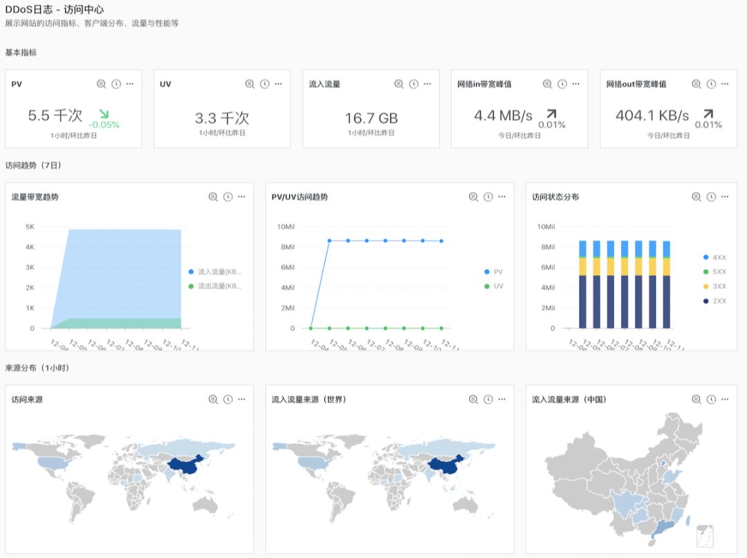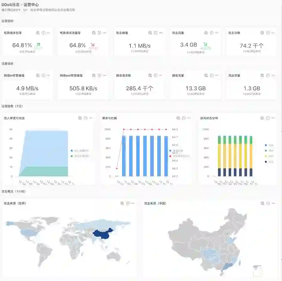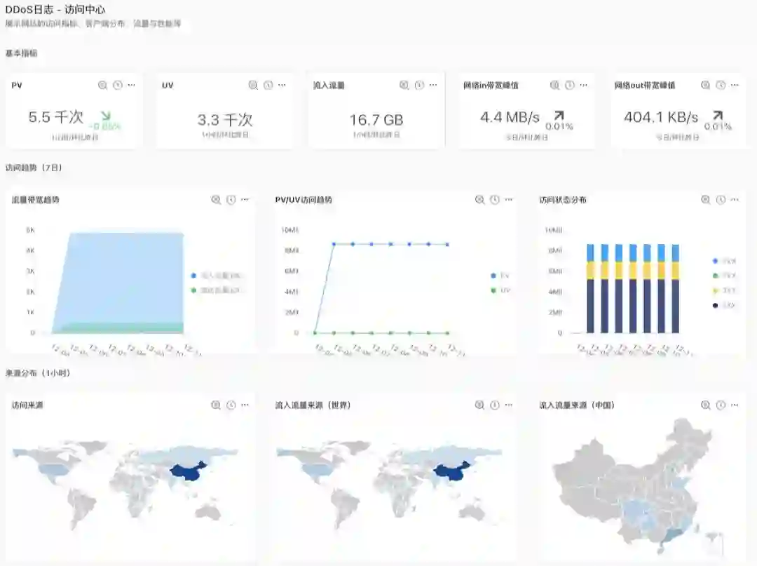 目前,云盾高防依托于日志服务提供网站业务全量日志的实时采集、秒级查询和深度分析,实现DDoS攻击防护数据化、透明化和可视化。实时展示被保护网站的总体运营状况和被访问状况,包括有效请求状况、流量趋势、CC攻击分布、PV/UV趋势、访问者分布、流量线路分布等数据,帮助用户在遭遇DDoS攻击时完整地记录下详细日志,并对关键业务或攻击进行深入分析。
