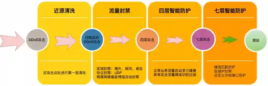 近源清洗:与运营商合作建立防护生态圈,在源头上进行清洗,近攻击点的第一层防护;