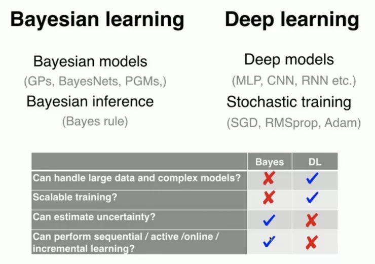 正如 Emtiyaz Khan 在他的演讲「Deep Learning with Bayesian Principles」中所强调的,贝叶斯学习和深度学习是有很大的而区别。