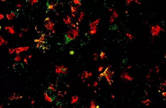 帕金森患者大脑中的免疫细胞会表达NLRP3炎性小体(inflammasome,绿色)。(图片来源:昆士兰大学)