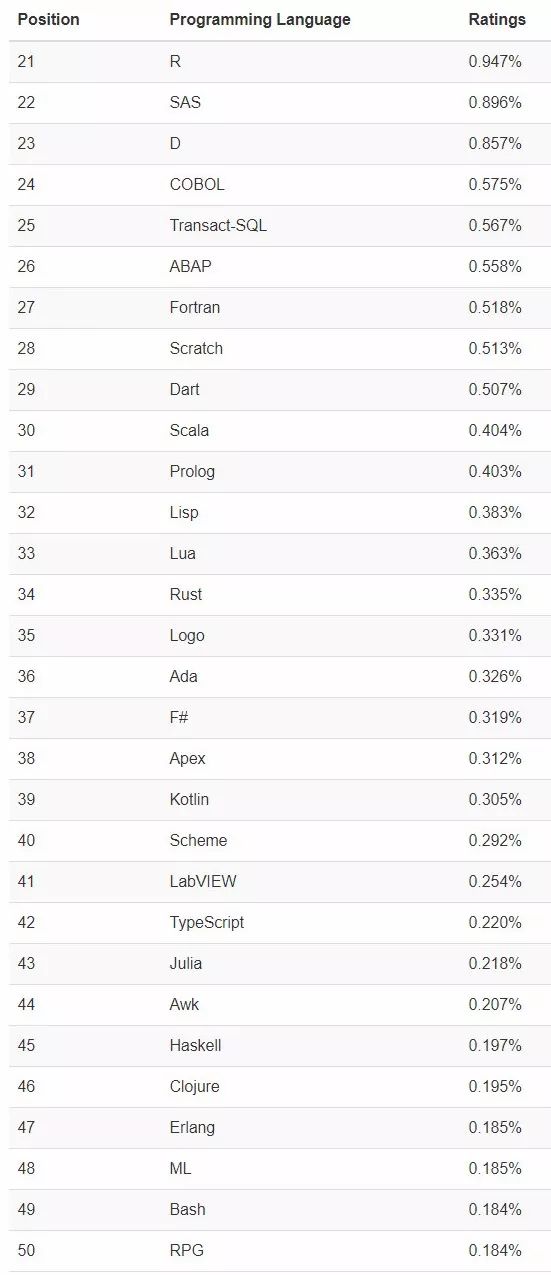 Top 21-50 编程语言排行