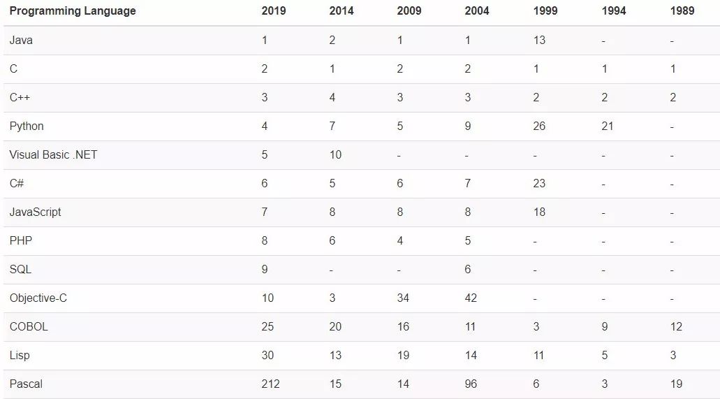 TIOBE 近日公布了2019年5月编程语言排行榜,总体排名变化不大,排名前十的依旧是:Java, C, C++, Python, Visual Basic .NET, C#, JavaScript, SQL, PHP 和汇编语言。