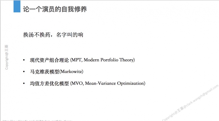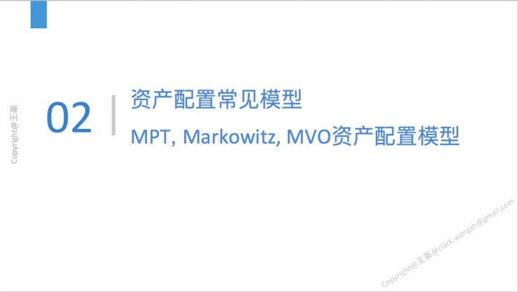 为什么我要仔细去讲这个模型呢?这个模型发轫于1952年,是一个很老的模型,虽然实用性值得商榷,但它却是其他所有量化资产配置模型的基础,相当于我们要学会1+1,只有当我们学会了资产配置中的1+1以后,我们后续才会讲1+2,1+3,但都是要有这个1+1的基础。所以大家一定要对这个模型比较了解。