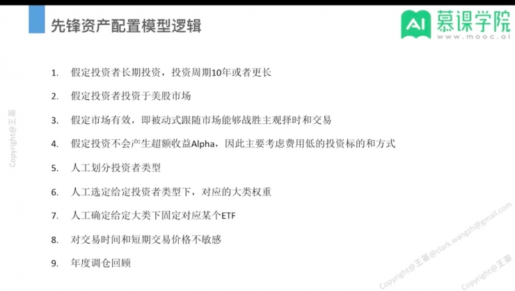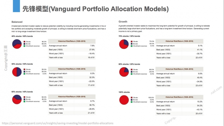今天我们会讲两个模型,第一个模型是美国也是世界第二大资产管理公司—先锋(Vanguard)所使用的资产配置模型。先锋在2016年介入智能投顾行业这个领域,它们的资产配置模型其实是对外采购的,我们先来看看这个资产配置模型的投资逻辑:
