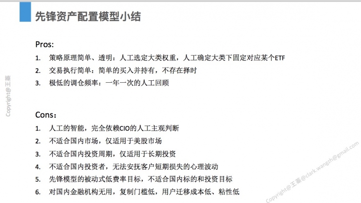 以上就是先锋的资产配置模型,所有工作都是纯人工去做的,这和国内某知名智能投顾提供商一样。这并不是我们真正想要的智能投顾。它的好处是什么呢?策略原理简单、透明,人工确定了所有的东西,所以你选的人非常厉害,是巴菲特之流,那么你的收益就会很高。交易执行也非常简单,一年一次,不存在调仓的考虑,所需的成本非常低,需要做的工作非常少。