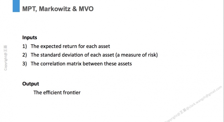 这个模型很简单,它的输入是三个元素:第一个是每一类资产的预期收益,也就是前面提到的收益项,第二个是每一项资产的标准差,也就是风险项,作为风险的衡量,第三个是各个资产之间的相关性,如果是多于两个资产,就是相关性矩阵,来衡量资产之间的关系。