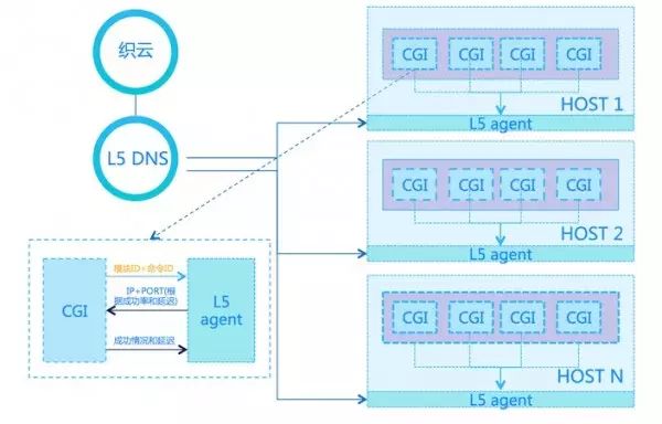 L5 有由 L5、DNS 和 L5、agent 两部分构成。CGI 通过给模块提 ID,根据模块下设备的成功率和延迟情况,通过 IP+PROT 给 CGI 一个反馈,访问之后,通过成功率和延迟情况,把数据上报给了 L5agent,然后做统计数据。