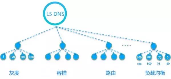 运营管理系统管理了上亿服务器,脉络非常清晰,根本不会出现混乱。L5 系统(上图)也类似于 DNS 系统,有一排能提供的服务模块,从而解决的单点问题。