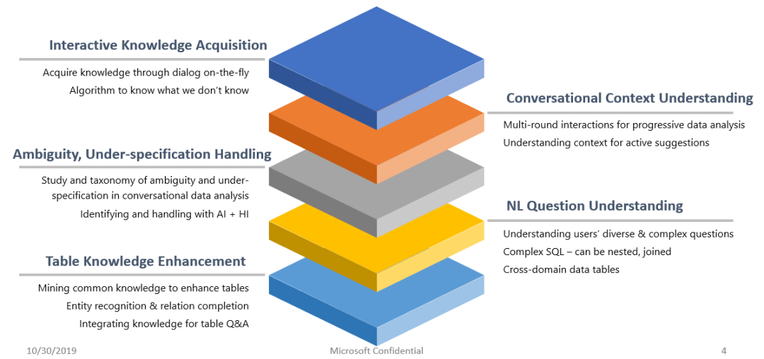 区别于普通的问答系统,对话式数据分析是一个典型的交叉领域,综合了自然语言理解、多维数据(multi-dimensional data)分析、机器学习、知识工程、人机交互等多个领域。建立一个端到端的对话式数据分析系统主要需要研究以下问题: