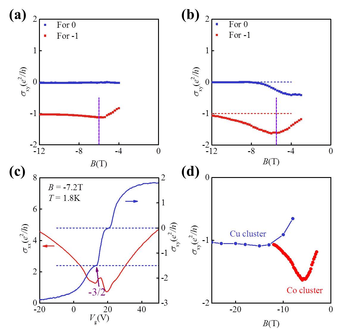 图7. 无磁性团簇修饰 (a) 和有磁性团簇修饰 (b) 的量子化轨迹图;(c) 中等磁场下半整数量子霍尔平台;(d) 磁性和非磁性团簇修饰的比较。