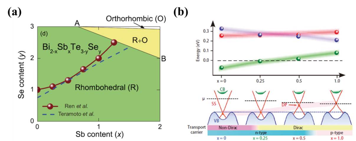 图3. (a)Bi2−xSbxTe3−ySey中的载流子类型调节,(b)Bi2−xSbxTe3−ySey的拓扑表面态演化。摘自文献[4、5]。