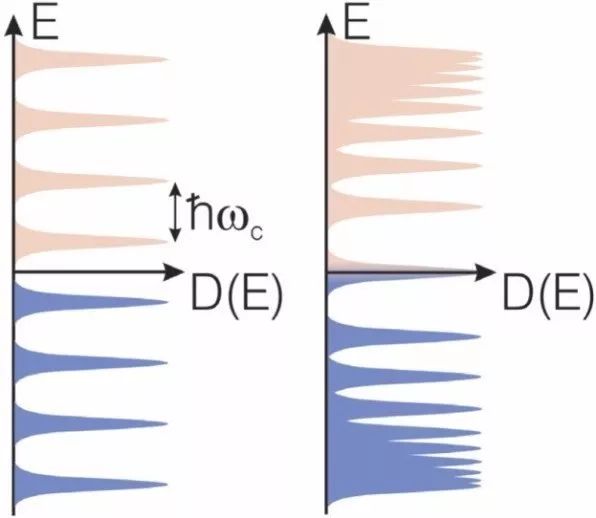 图2. 二维电子气中的朗道能级(左),是整数化的;狄拉克锥中的朗道能级(右),是半整数化的。摘自文献[2]。