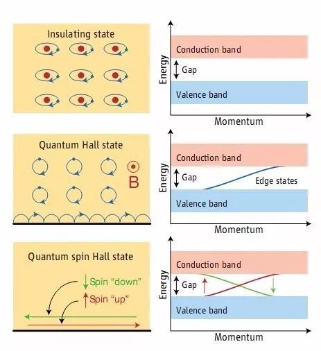 重要的概念重复一遍:对真空或一般绝缘体,TKNN拓扑不变量为零。量子霍尔体系TKNN拓扑不变量不为零,其与真空之间存在一个导电表面态,即边缘态,表现出量子霍尔电导,如图1中间图所示。这一边缘态将量子霍尔效应与拓扑完整联系起来,解惑了外行感到很奇怪的问题:量子霍尔效应为何会与千里之外的拓扑有联系?