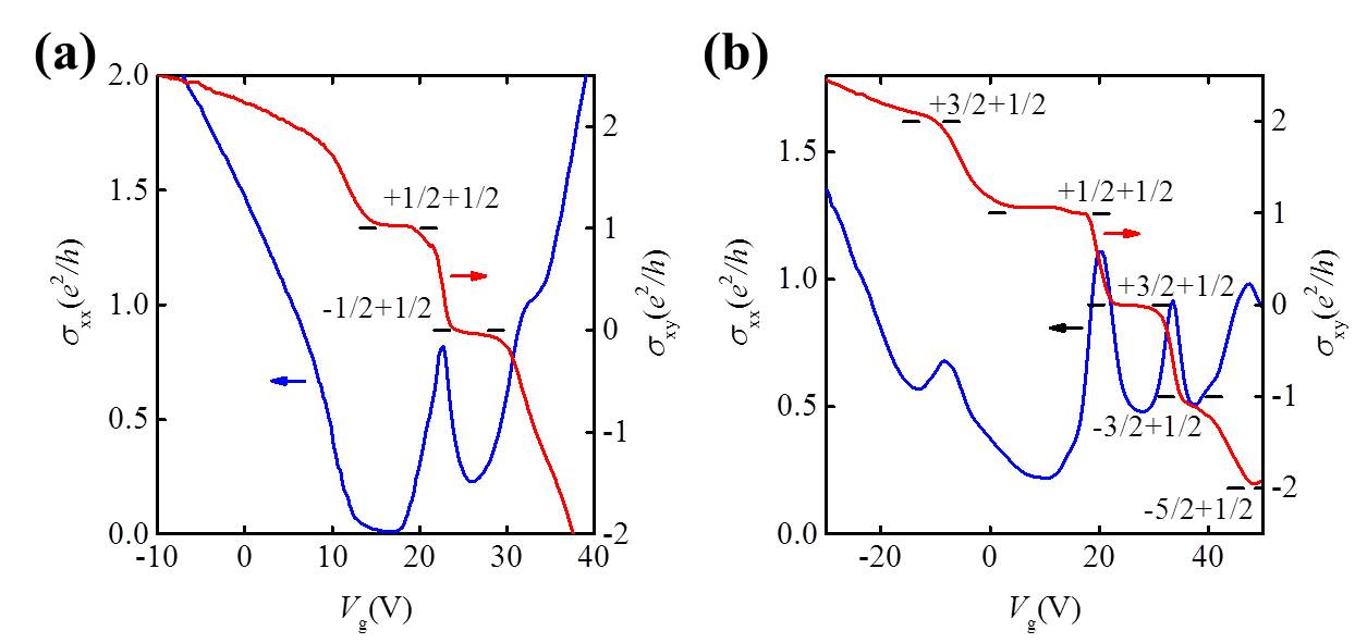 通过机械剥离、电子束光刻、电子束沉积等成熟加工,可以制备出以很薄的BiSbTeSe2单晶片作为沟道的场效应管器件。样品沟道层厚度100 nm量级、长宽10 μm的量级,完全满足测量表面态量子霍尔电导的条件。测量通过固定磁场、扫描栅压来进行。类似的测量已有报道,虽然前人测量的结果依然是整数量子霍尔电导,只不过是通过双极性来间接测度半整数电导,并非直接测量到半整数电导 [6、7]。