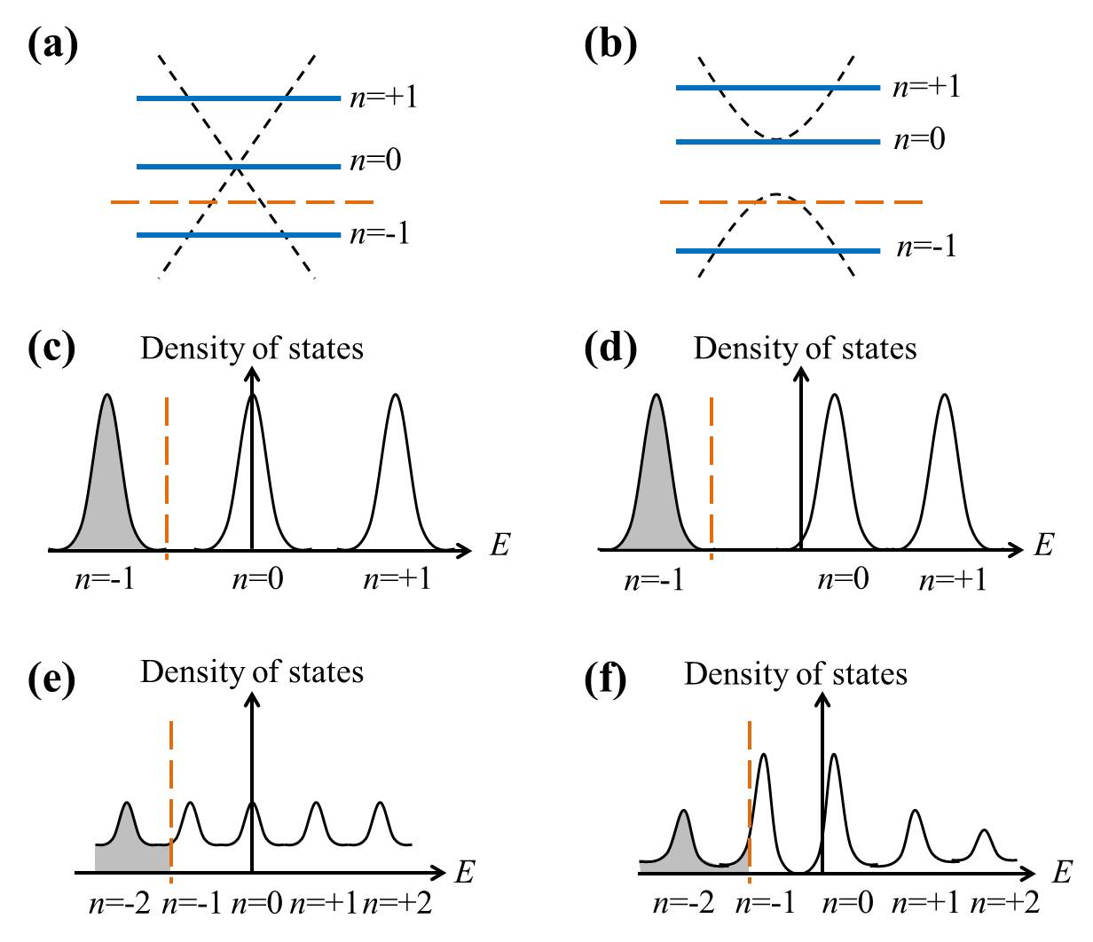 图8. (a、c、e)无磁性团簇修饰的朗道能级示意图,(b、d、f)有磁性团簇修饰的朗道能级示意图。橘黄色虚线代表费米能级。