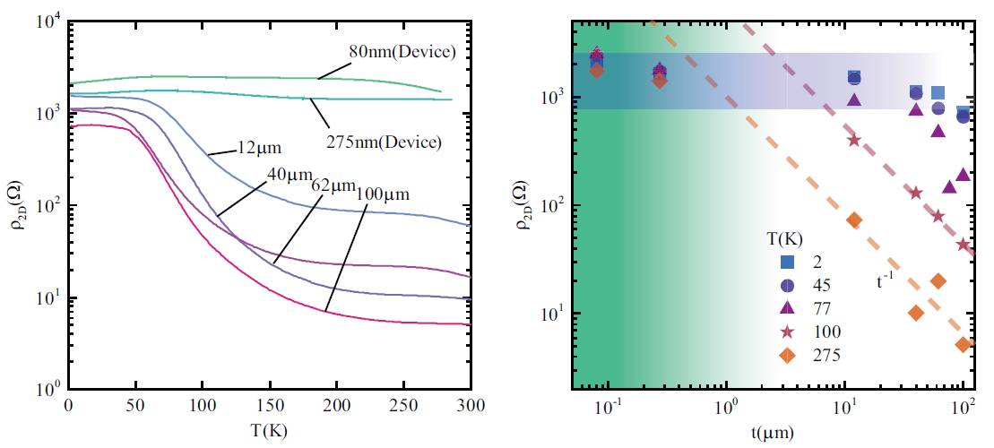 图4. BiSbTeSe2单晶的变温二维电阻率(左)和不同温度二维电阻率与样品厚度的关系(右)。