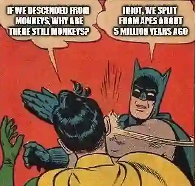 实际上,“如果人是猴子变的,那么世上为什么还有猴子?”这个问题等同于: