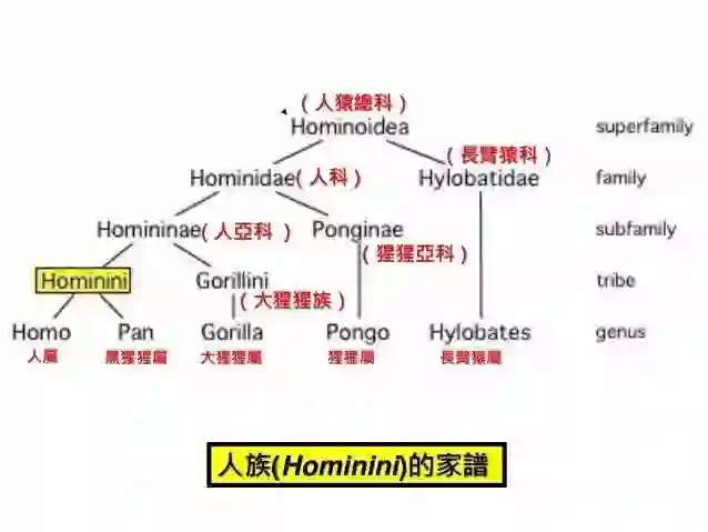 按照共同祖先算的话,现在的人类(智人种),还有灭绝的人类(如尼安德特人种)都有共同的祖先,所以我们组成了人属。因为人属和黑猩猩属有共同的祖先,所以它们成了一个更大的集合——人族。再往上,人族和大猩猩族有共同的祖先,又构成了一个集合——人亚科。人亚科和猩猩亚科有共同的祖先,一起构成了人科。再往上,人科和长臂猿科有共同祖先,一起组成了人猿总科。再往上,是类人猿下目。再接着往上,大部分猴子(跗猴型下目)和猿(类人猿下目)因为有共同的祖先所以被合并到了一起,它们被叫做“简鼻亚目”(higher primates)。简鼻亚目和原猴亚目由于有共同的祖先,所以一起构成了灵长目。