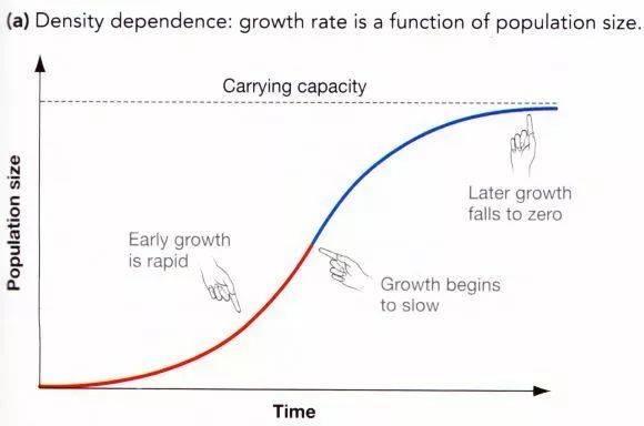 兔子越来越多,资源越来越稀缺,意味着死亡率持续增加而出生率下降,早晚会有一天二者相等。这时,兔子数量饱和,不再增加,所有的兔子都过着饿肚子且早死的不幸生活。这个数量被称为环境承载量K。