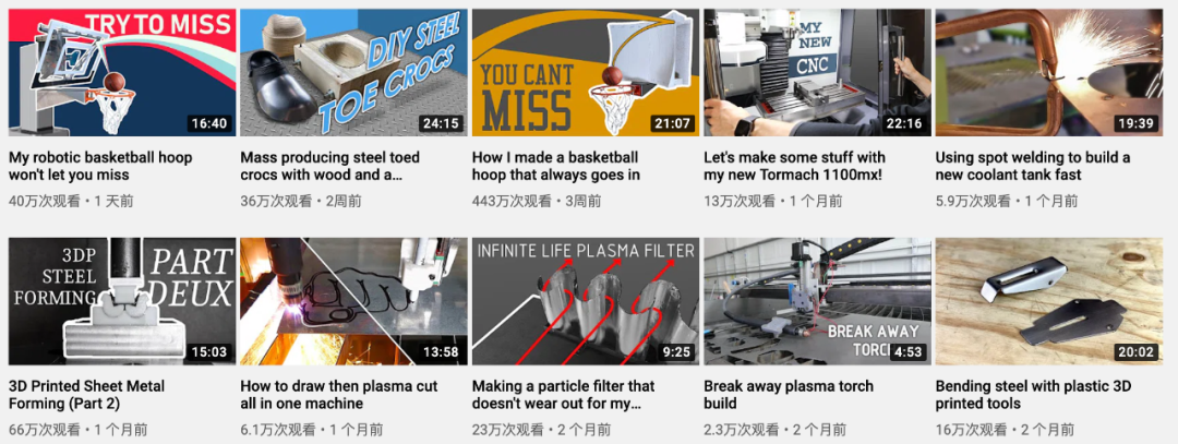 除了我们介绍的两个篮板视频外,Shane Wighton 的 YouTube 频道中的其他视频也多与「制造」相关。