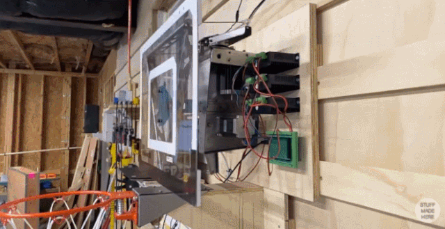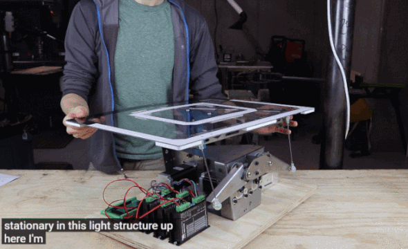 他在篮板的后面安装了 3 个小电机,每个电机控制一个连杆,因此这个篮板有三个自由度。由于电机功率较小,所以他选择的篮板质地很轻。