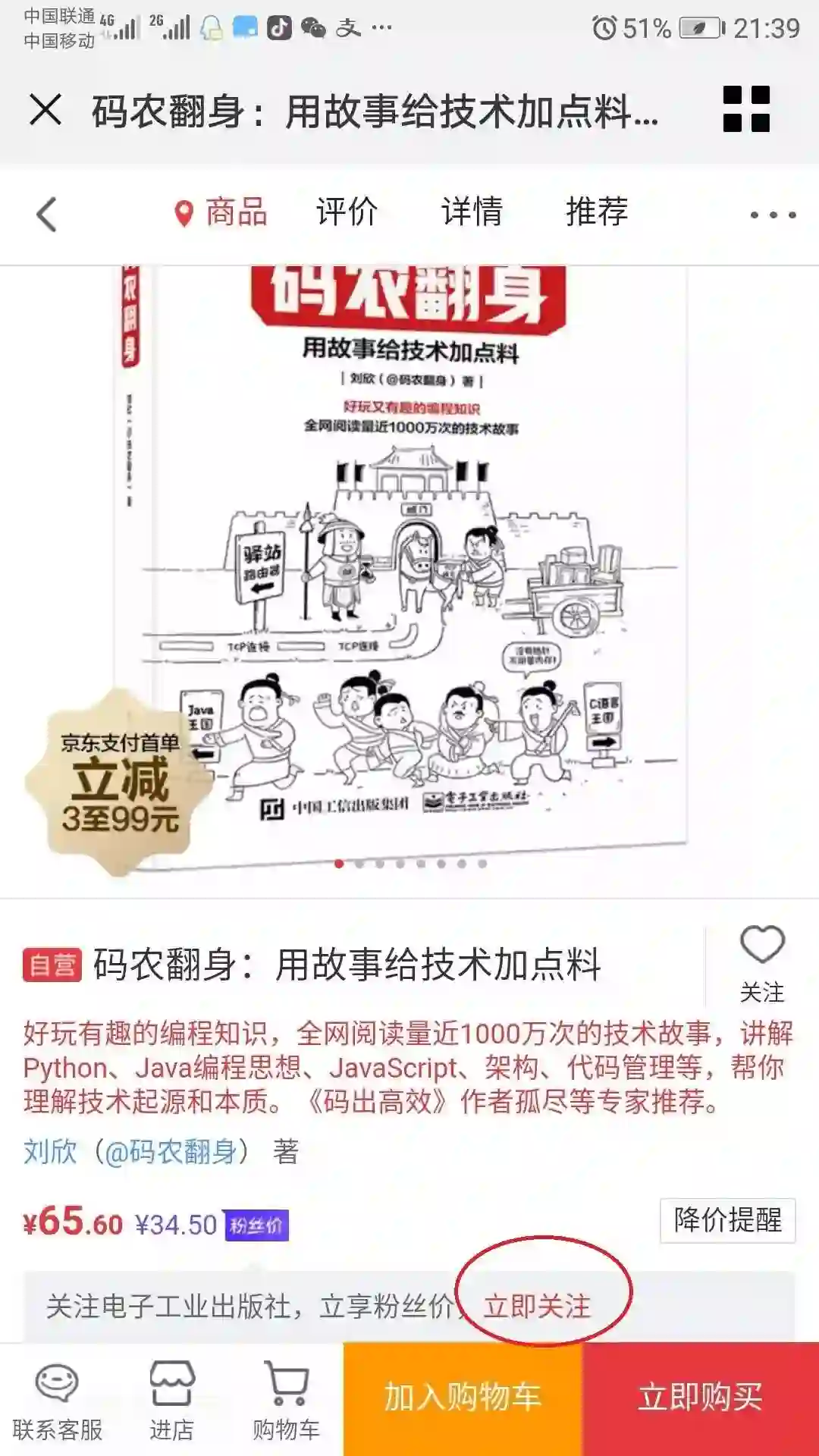 优惠放送 !!!这两天我的书《码农翻身》正在京东上搞活动,只要关注“电子工业出版社”的店铺,就可以享受半价购买我的书《码农翻身》,非常划算。