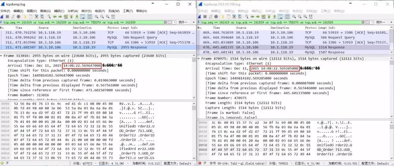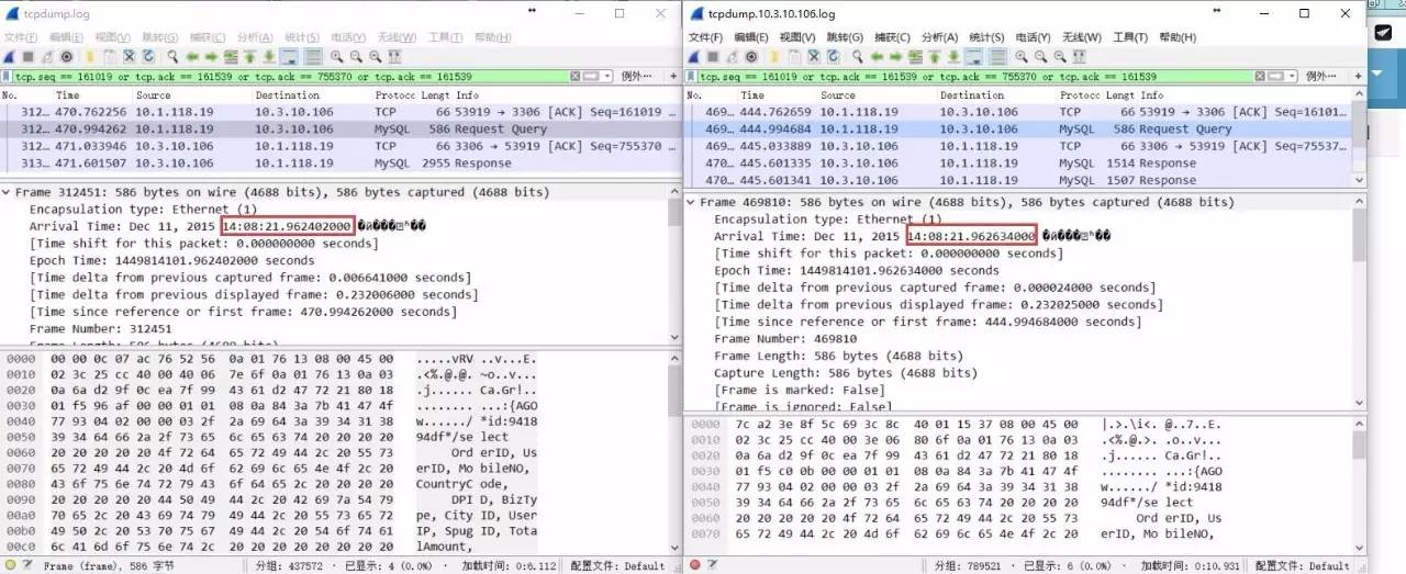 方法:分别在APP Server与MySQL Server部署TcpDump抓包工具,得到数据包在4个监测点的“到达时间”。为了方便,把如下4个Wireshark分析结果(对TcpDump抓取日志分析)按4个方位标注: