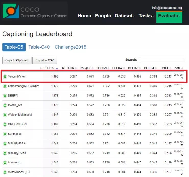 经过充分的训练,腾讯 AI Lab 研发的图像描述生成模型在微软 MS COCO 的 Captions 任务上排名第一,超过了微软、谷歌、IBM 等科技公司。