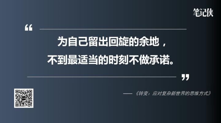 为自己留出回旋的余地,不到最适当的时刻不做承诺。对未来保持开放的态度。如此,我们就能够对不可预知的事件和随着进展转而不利的事件加以灵活应对。