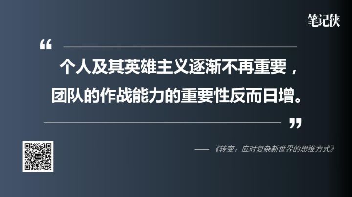 你会发现,在一个复杂的社会中,个人及其英雄主义逐渐不再重要,团队的作战能力的重要性反而日增。团队成员要以多种方式将关键性的知识结合起来,创新性地提出和实施更适合的解决方案。