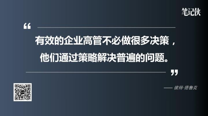 这里引用彼得·德鲁克的一句话:有效的企业高管不必做很多决策,他们通过策略解决普遍的问题。