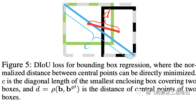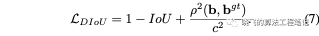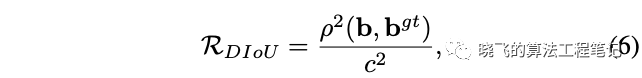论文提出了能减少两个box中心点间的距离的惩罚项, 和 分别表示 和 的中心点。 是欧氏距离, 是最小包围两个bbox的框的对角线长度