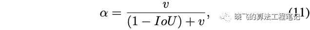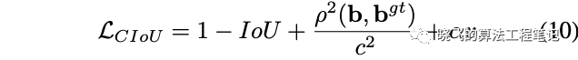 论文考虑到bbox回归三要素中的长宽比还没被考虑到计算中,因此,进一步在DIoU的基础上提出了CIoU。其惩罚项如公式8,其中 是权重函数,而 用来度量长宽比的相似性