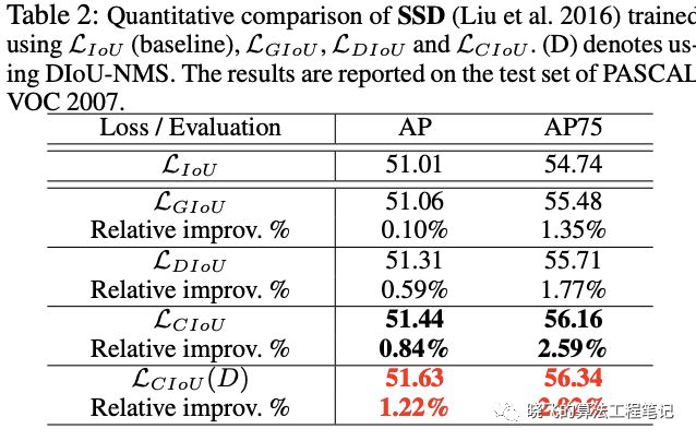 在SSD-FPN上进行实验对比,因为本身模型已经精度很好了,DIoU loss和CIoU的效果不是很显著,但仍有提升。mAP分别提升0.59%和0.84%,而AP75则分别提升1.77%和2.59%,而使用DIoU-NMS则能进一步提升效果
