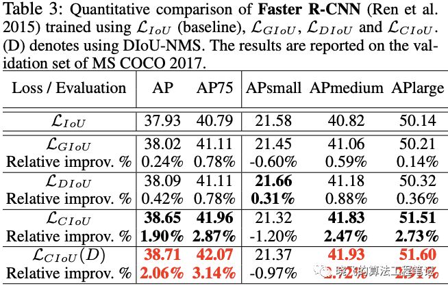 在Faster R-CNN ResNet-50-FPN上,由于Faster R-CNN本身提供的bbox质量都比较高(即在图4的盆地),因此,GIoU的优化都很小,但此时DIoU和CIoU则表现了不错的优化效果。注意到,CIoU在小物体上的性能都有所下降,可能由于长宽比对小物体的检测贡献不大,因为此时中心点比长宽比重要