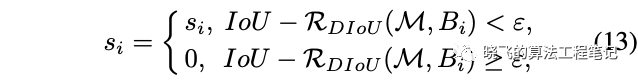 其中 是分类置信度, 为NMS阈值, 为最高置信度的框。DIoU-NMS倾向于中心点距离较远的box存在不同的对象,而且仅需改几行代码,DIoU-NMS就能够很简单地集成到目标检测算法中