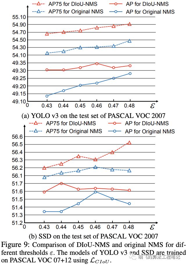 为了进一步验证DIoU-NMS的效果,进行了对比实验。如图9所示,DIoU-NMS的整体性能都比原生的NMS效果要好