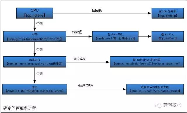 有了基本的系统模块划分,以及每个模块对应的分析工具,我们可以尝试将问题的排查抽象成一个相对固定的流程。大致的思路是: