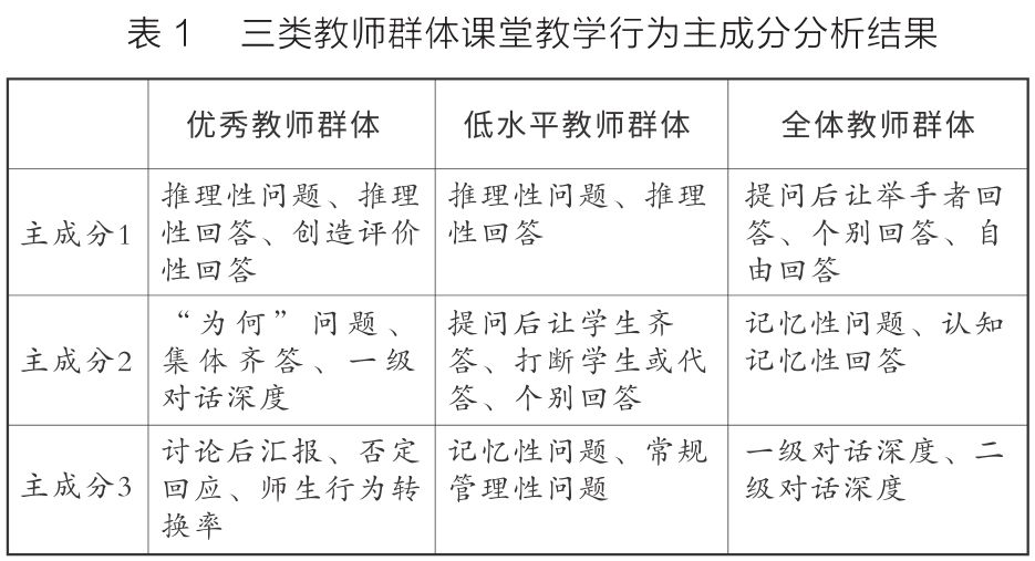 我们运用主成分分析法,将优秀教师群体、低水平教师群体和全体教师群体的课堂教学行为大数据进行了分析(见表1)。