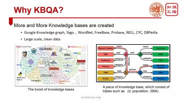 现在我们来谈谈知识库。近年来,我们目睹了知识库的发展,越来越多的大规模知识库涌现出来,如Google Knowledge graph,Yago和Freebase等。这些知识库具有体量大,质量高的特点。