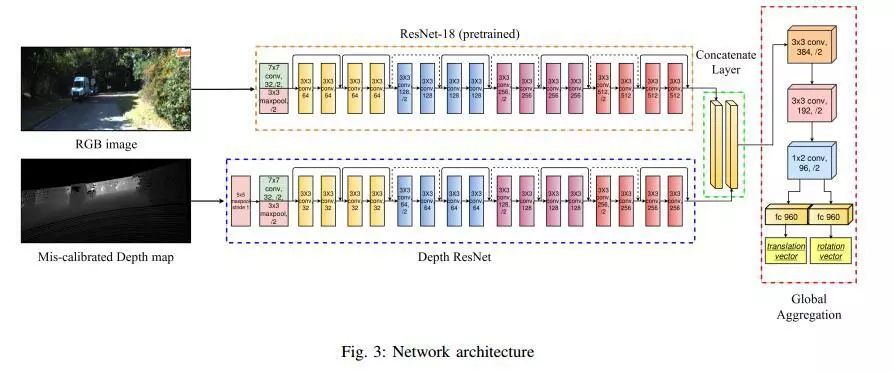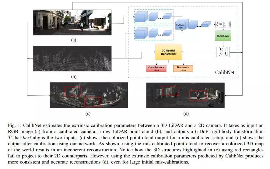 图1 CalibNet估计3D LiDAR和2D相机之间的外部校准参数。它将来自校准相机的RGB图像(a),原始LiDAR点云(b)作为输入,并输出最佳对齐两个输入的6-DoF刚体变换T. (c)显示错误校准设置的彩色点云输出,(d)显示使用我们的网络校准后的输出。如图所示,使用误校准的点云来恢复世界的彩色3D地图导致不连贯的重建。注意(c)中使用红色矩形突出显示的3D结构如何无法投影到其2D对应物。然而,使用CalibNet预测的外部校准参数可以产生更一致和准确的重建(d),即使对于大的初始误校准也是如此。