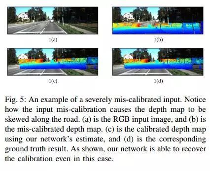 图5 严重误校准输入的示例。注意输入误校准是如何导致深度图沿着道路倾斜的。(a)是RGB输入图像,(b)是误校准的深度图。(c)是使用我们网络估计的校准深度图,(d)是相应的地面实况结果。如图所示,即使在这种情况下,我们的网络也能够恢复校准。