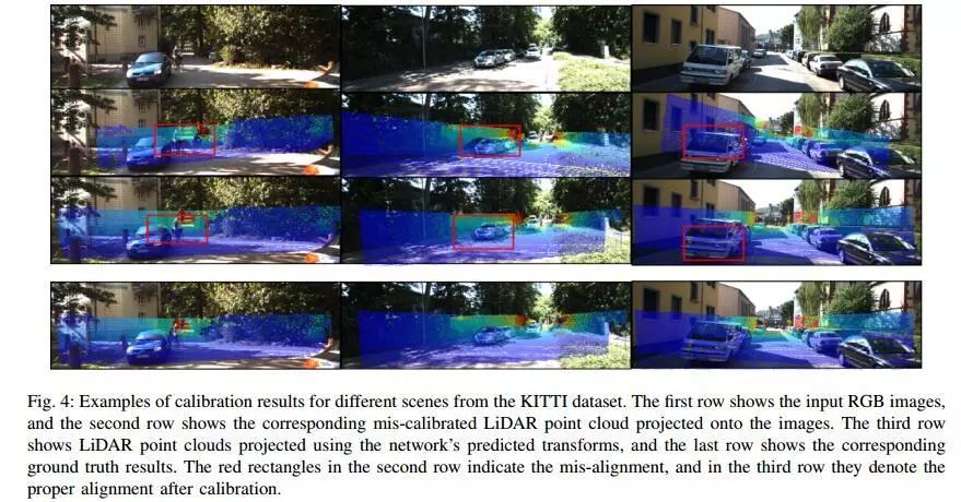 图4 来自KITTI数据集的不同场景的校准结果示例。第一行显示输入的RGB图像,第二行显示投影到图像上的相应的错误校准的LiDAR点云。第三行显示使用网络预测变换投影的LiDAR点云,最后一行显示相应的地面实况结果。第二行中的红色矩形表示未对齐,而在第三行中,它们表示校准后的正确对齐。