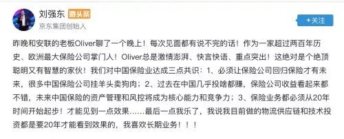 刘强东表示,与安联保险CEO Oliver谈话之后,对中国保险业达成三点共识:一是,必须让保险公司回归保险才有未来,很多中国保险公司挂羊头卖狗肉;二是,过去在中国几乎投啥都赚,保险公司收益看起来都不错,未来中国保险的资产管理和风控将成为核心能力和竞争力;三是,保险业务都必须从20年时间开始起步!才能见到一点效果。