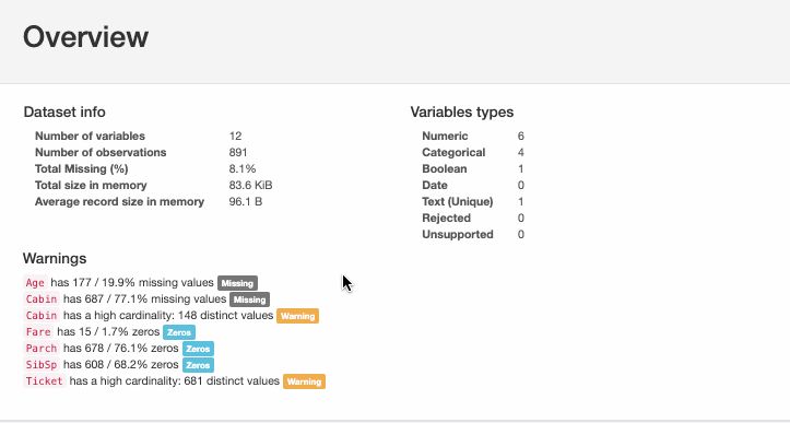 #importing the necessary packagesimport pandas as pdimport pandas_profilingdf = pd.read_csv('titanic/train.csv')pandas_profiling.ProfileReport(df)