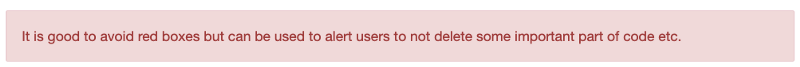 <div class="alert alert-block alert-danger">It is good to avoid red boxes but can be used to alert users to not delete some important part of code etc.</div>