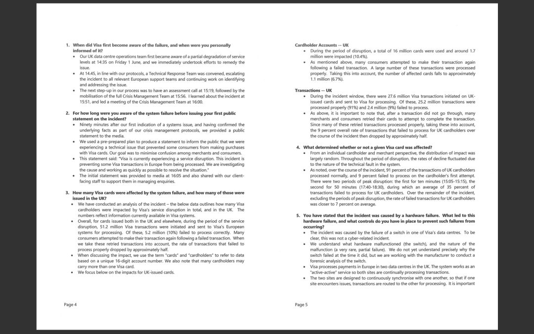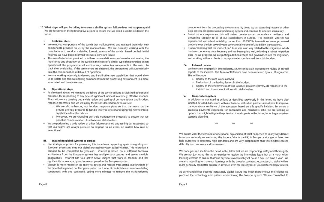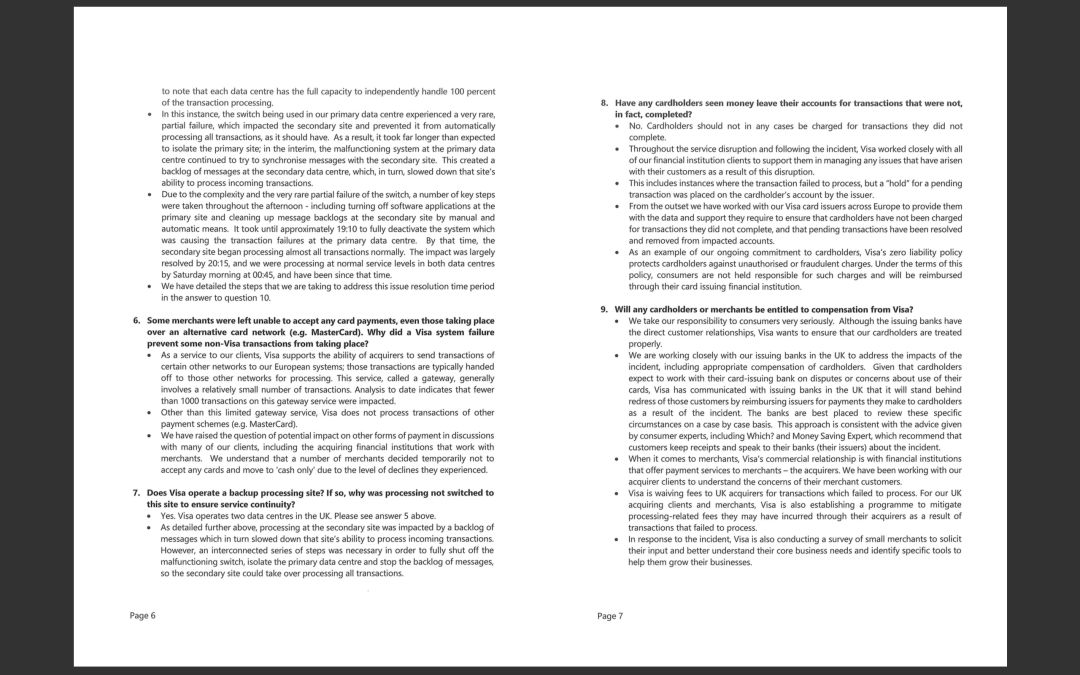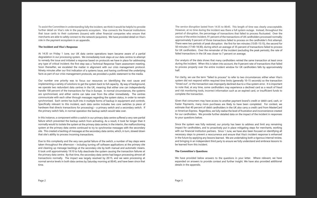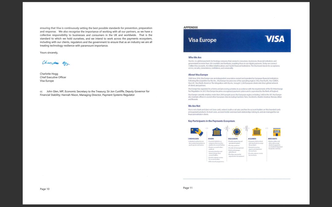 维萨欧洲首席执行官夏洛特•霍格(Charlotte Hogg)在上周晚些时候致英国财政委员会的信函(见文末)中解释了这个错误,并就这起故障发表了“坦诚的”道歉。英国财政委员会之前要求该公司就此事作出解释。