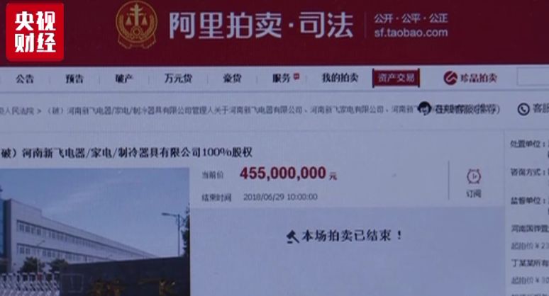 今天上午10点,此次拍卖的标的物河南新飞电器、新飞家电、新飞制冷器具有限公司100%股权成功拍卖,成交价为4.55亿元。这场持续24小时的拍卖仅有两次报价,第一次报价是4.5亿元,在拍卖即将结束前10分钟,康佳电器出价4.55亿竞拍成功,成为新飞公司新的投资人。