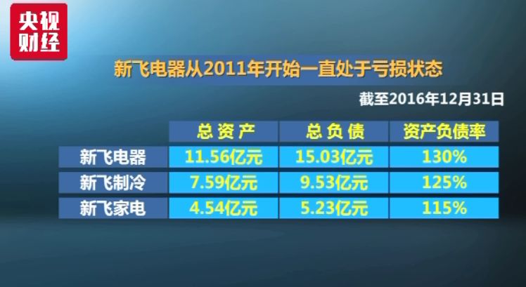 新飞电器从2011年开始一直处于亏损状态。截至2016年12月31日新飞电器、新飞制冷和新飞家电,总资产分别为11.56亿元、7.59亿元和4.54亿元,总负债分别为15.03亿元、9.53亿元和5.23亿元,资产负债率分别高达130%、125%和115%。