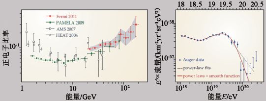 图3 宇宙线最新结果(a)PAMELA和Fermi卫星能谱仪测到的正电子比率在10—200GeV 能区令人惊讶地持续上升;(b)由PierreAuger观测站测量到的1018eV 能量以上宇宙线能谱,在3暳1019eV附近的陡降可能是预计的Greisen-Zatsepin-Kuzmin(GZK)截断.曲线和直线是对数据的不同拟合